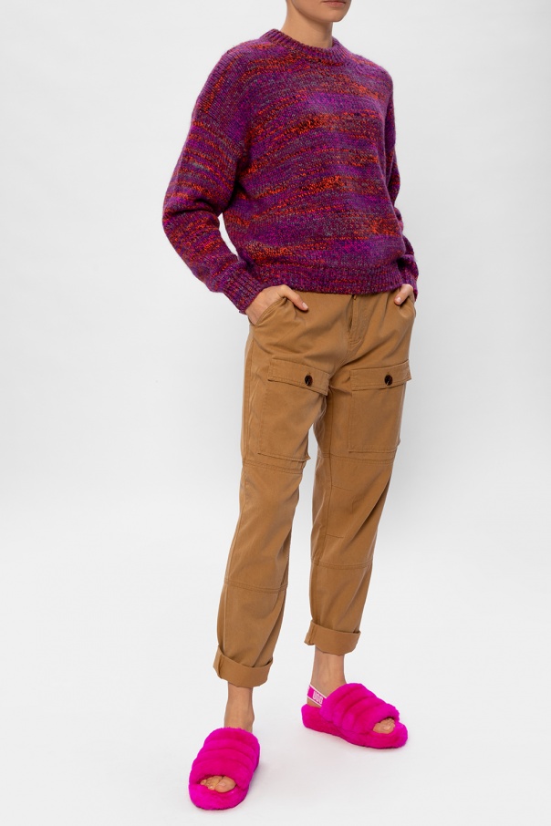 Pink \'W Fluff Yeah\' slides from UGG. Crafted from lamb fur, this pair sits on a brown and pink rubber sole and showcases webbing strap with pink and white jacquard branding.