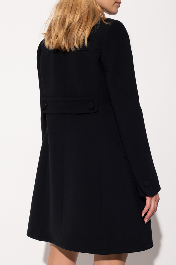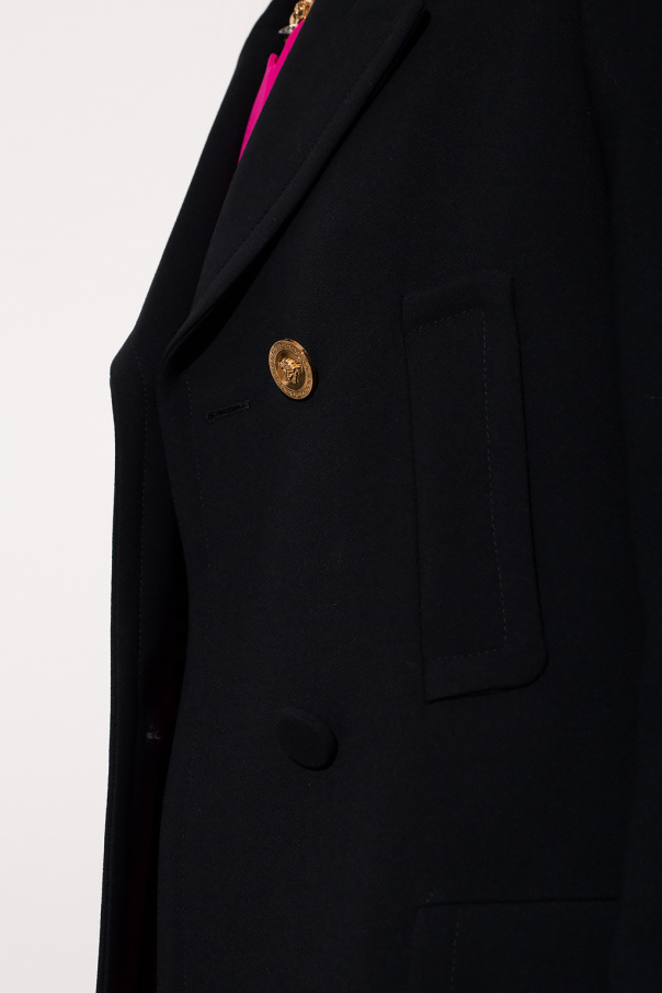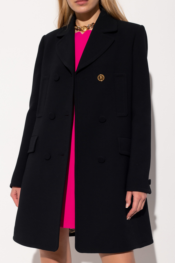 Black double-breasted coat from Versace. Crafted from wool, this long sleeve design features button fastenings, notch lapels and four snap-fastened pockets.