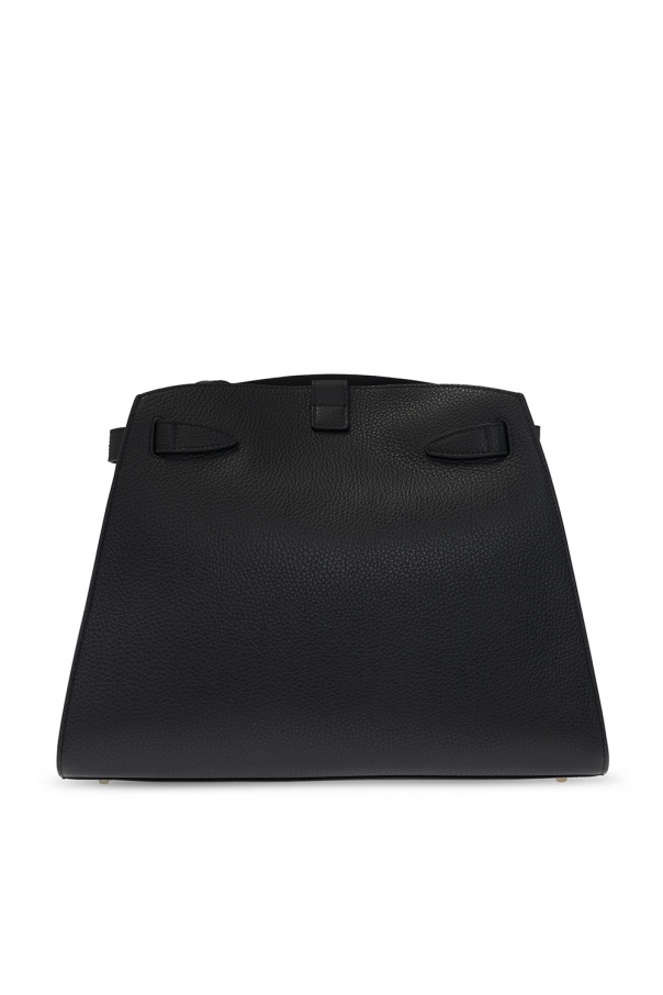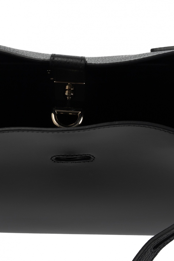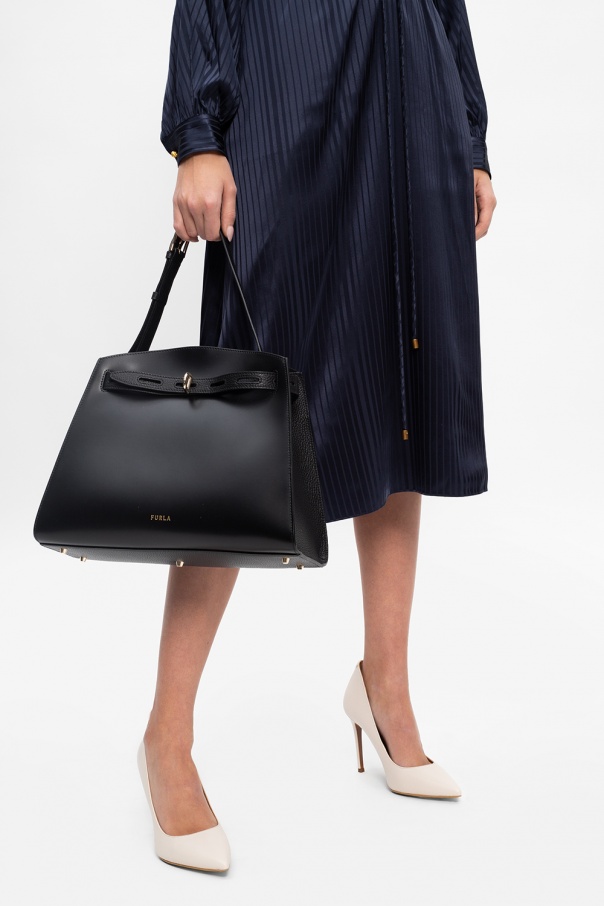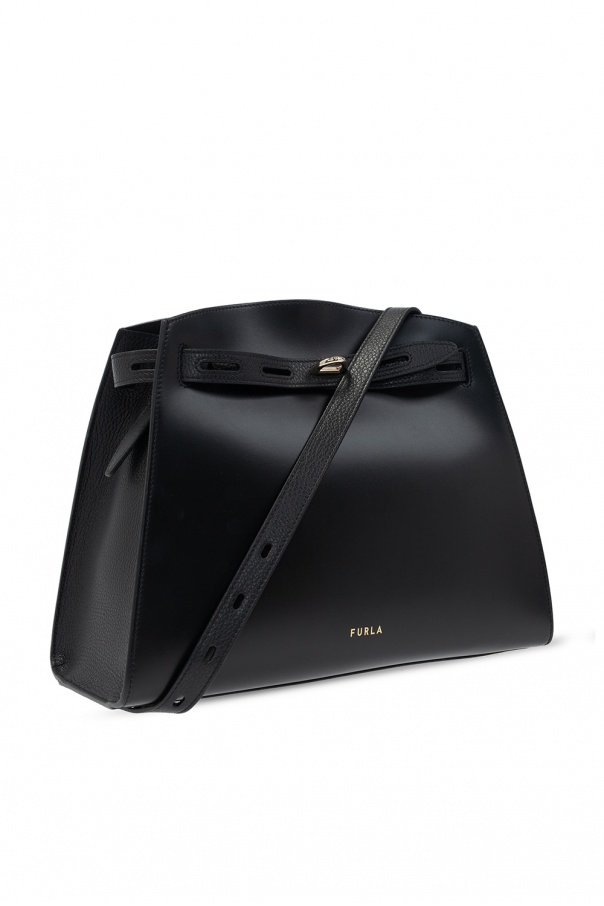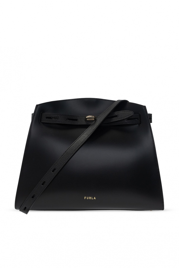 Black \'Margherita\' shoulder bag from Furla. Size medium. Designed with a distinctive fastener with an embossed logo, this textured calf leather-crafted item is complete with gold-tone metal hardware, including logo plaque on the front, an adjustable shoulder strap and interior with one compartment, two slip pockets and one zipped pocket.