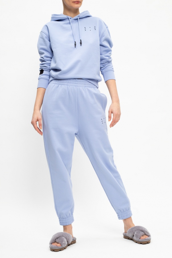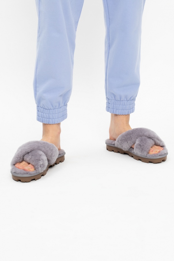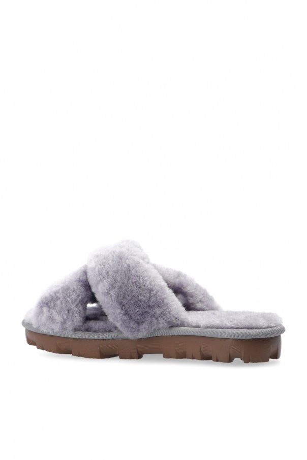 Grey ‘W Fuzzette’ slides from UGG. Crafted from sheep fur, this design features a logo detail and brown rubber sole.