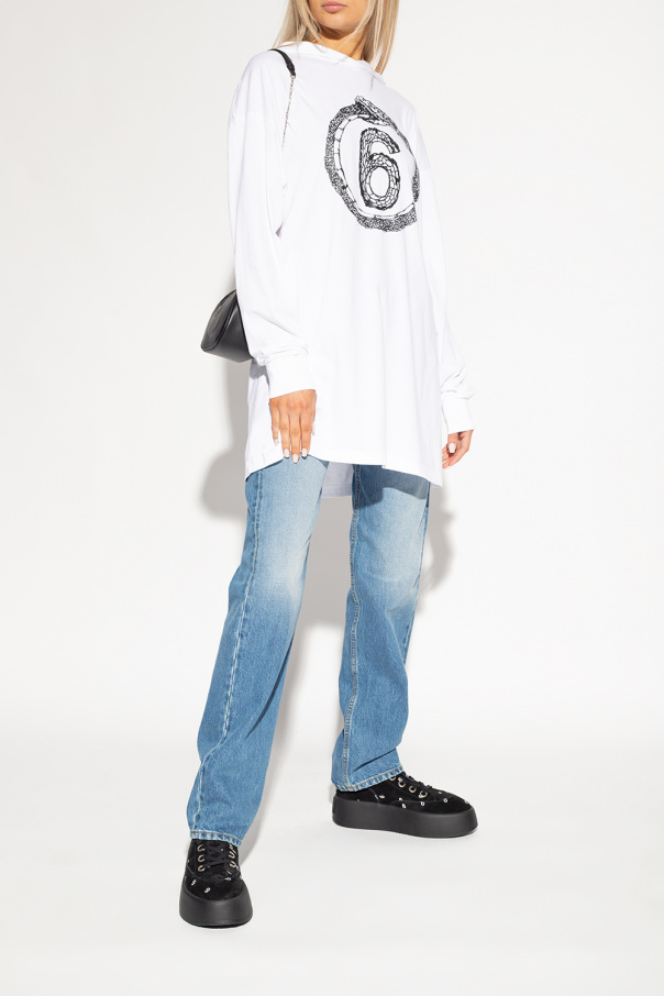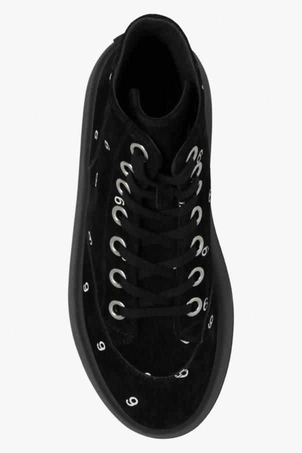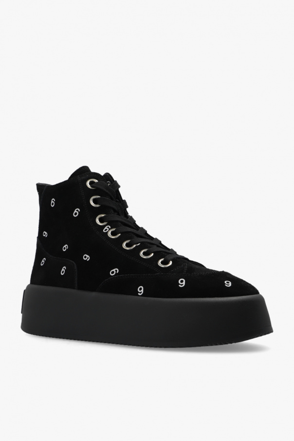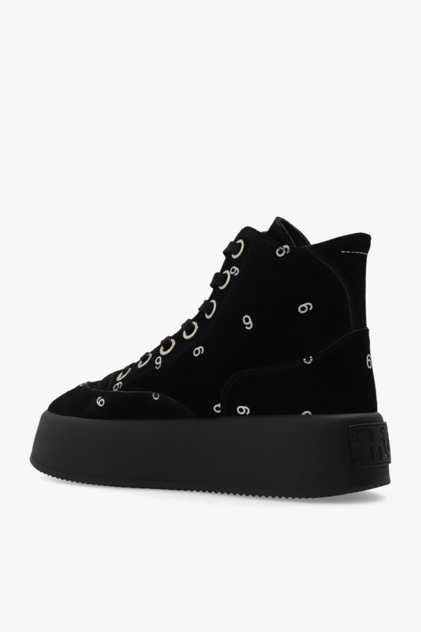 Black platform ankle boots from MM6 Maison Margiela. Made from suede, this model sits on a black rubber sole and showcases a white logo pattern.