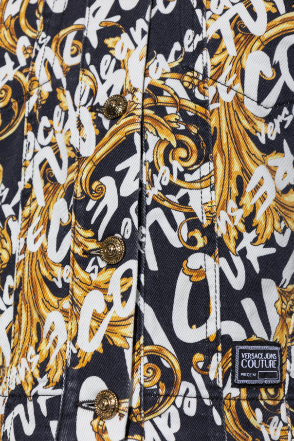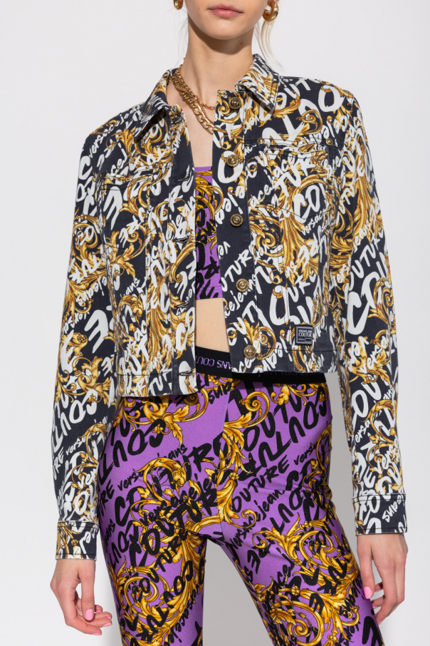 Black cropped denim jacket from Versace Jeans Couture. Fastened with buttons, this garment features the label’s signature Baroque motif in brown and yellow, white logo pattern, decorative patch, four slip pockets and long sleeves with button cuffs.