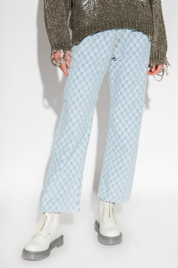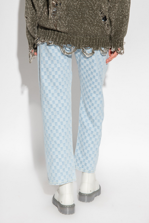 Light blue boyfriend jeans from R13. Embellished with a check pattern, this pair features a zip fly with a button and classic five pockets.