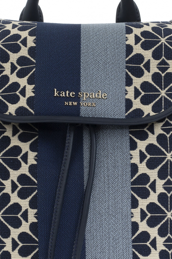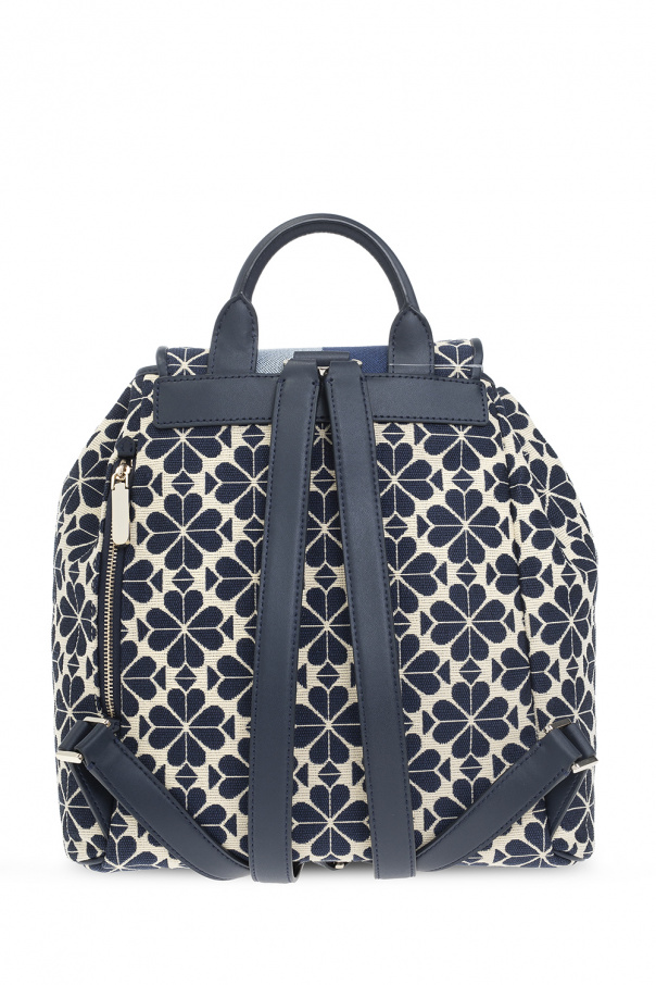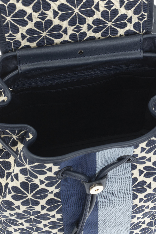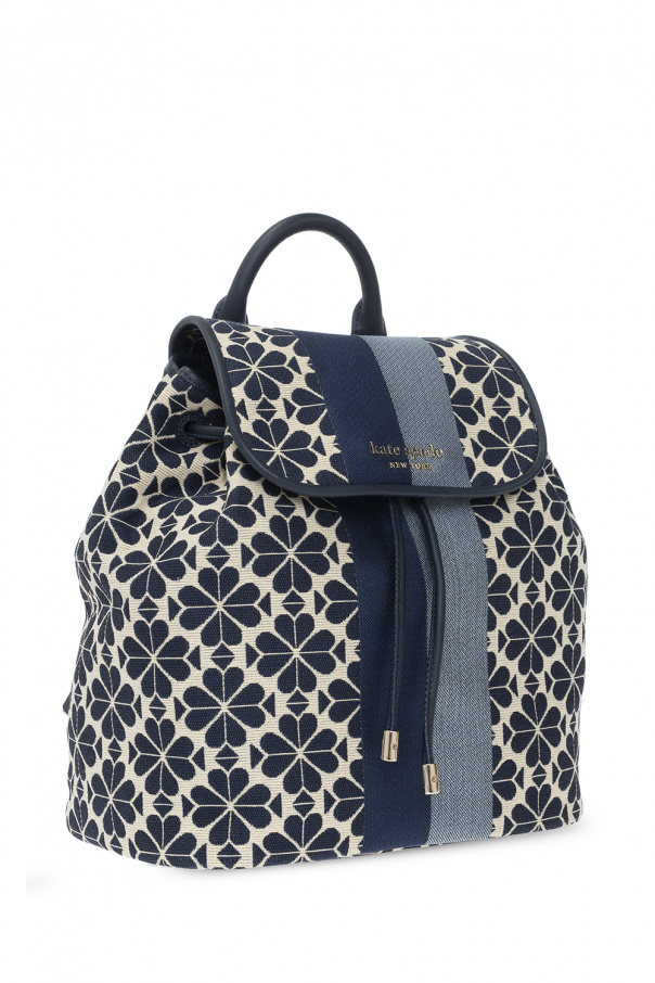 Cream and navy blue backpack from Kate Spade. Crafted from jacquard fabric woven with the brand's signature spade flower pattern, this design cinches closed with leather drawstrings and showcases a blue and navy blue stripe across the front, a metal snap fastener, a gold-tone logo application on the front, a half-round top handle, adjustable shoulder straps, gold-tone metal hardware and one internal compartment with one zip pocket and three slip pockets.