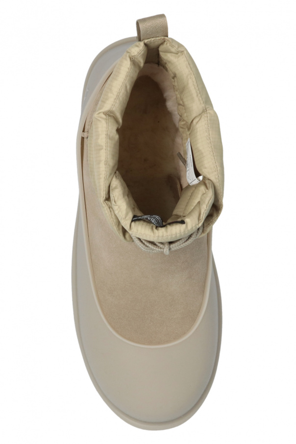 Greyish beige ‘Classic Mini Lace Up Weather’ snow boots from UGG. Made of durable Ripstop and suede, this pair features an innovative DryTech membrane, which forms a waterproof barrier for enhanced protection from the elements. It uses down accredited by the Responsible Down Standard and is set on a UGGplush™ wool blend insole with detachable greyish beige rubber overlays and greyish beige rubber outsole.