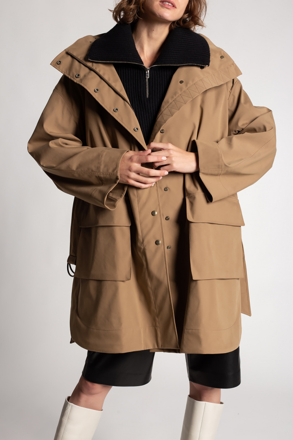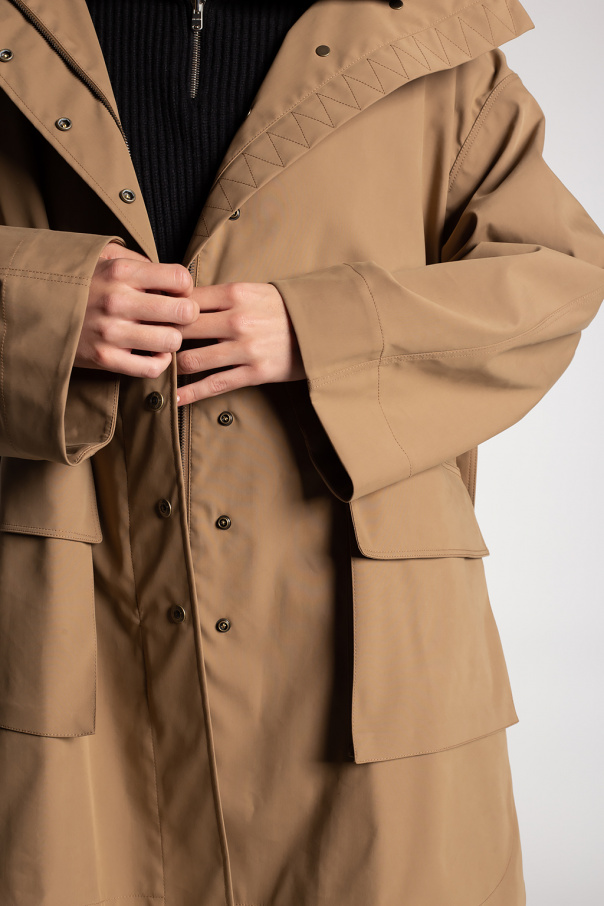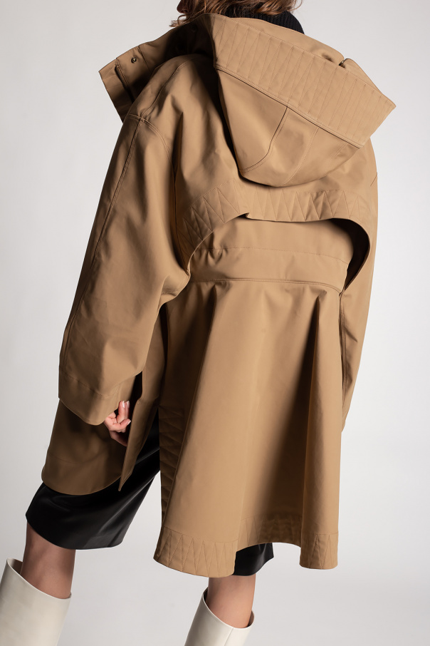 Brown hooded coat from Alaia. Crafted from water-resistant technical cotton, this style fastens via a zip and snaps and features two flapped pockets on the front, a waist-cinching buckle belt and slits on the sides.