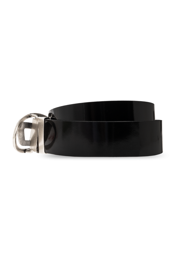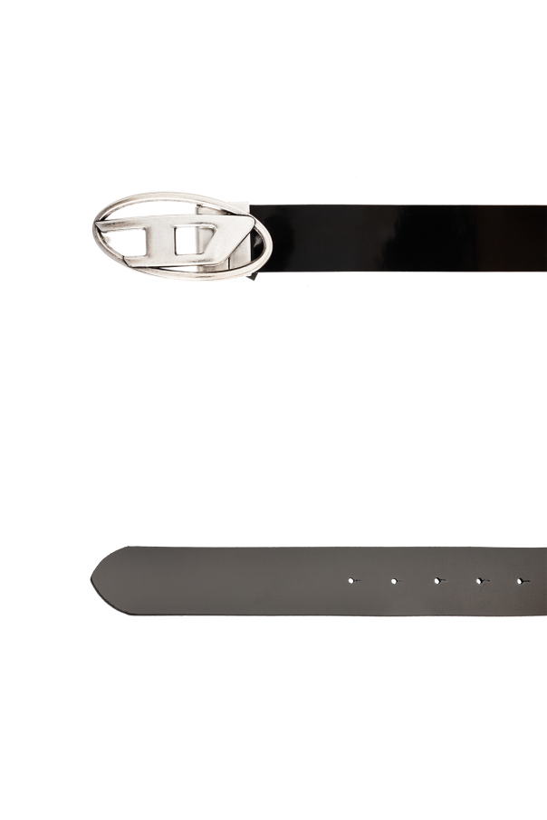 Reversible belt in black and grey from Diesel. Made of leather, this item features an antiqued silver-tone metal buckle in the shape of a logo.