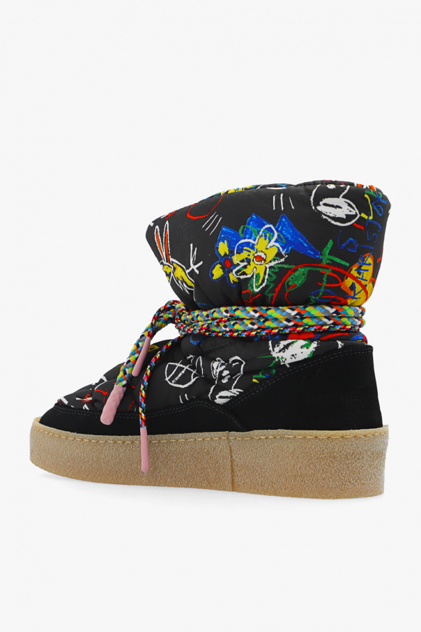 Black snow boots from Khrisjoy. Crafted from insulated technical material decorated with a colourful pattern, this model features leather trims, lace-up fastenings accentuated with woven drawstrings, an embossed logo at the back and a beige rubber sole at the base.