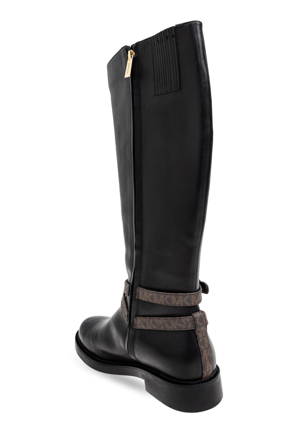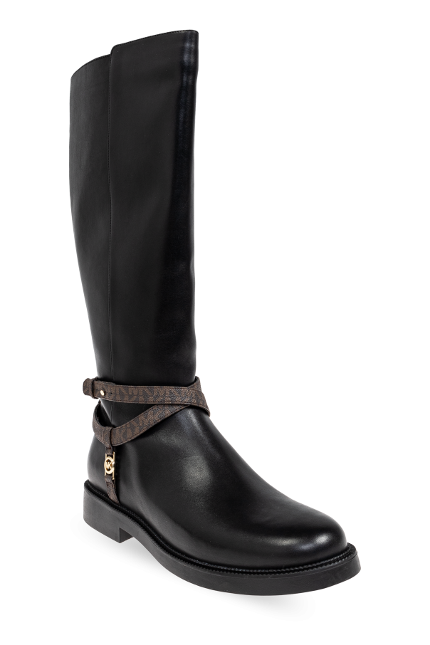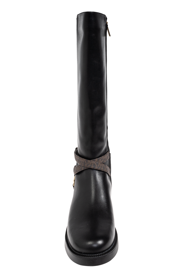 Introducing the Abigail Boots from the exclusive collection by the renowned designer Michael Michael Kors. Crafted from high-quality black leather, these knee-length boots epitomize elegance and luxury. The Abigail Boots feature a sleek, rounded toe design that extends up to the knee, exuding sophistication. The glossy, smooth leather exterior enhances their opulent appearance, while the mid-heel provides a perfect balance of style and comfort. An exquisite brown strap with a subtle pattern adorns the ankle, complemented by a gold element showcasing the designer’s logo, adding an air of prestige. An elastic panel at the back ensures a snug fit around the calf, enhancing both comfort and silhouette. The inner side zipper, in a rich gold tone, allows for easy wear and removal, seamlessly blending functionality with fashion. The solid sole, constructed from durable material, guarantees lasting comfort and support. Why Choose the Abigail Boots? Versatile design suitable for both elegant and casual outfits Timeless style that transcends seasons High-quality craftsmanship and attention to detail Prestigious brand synonymous with luxury and sophistication