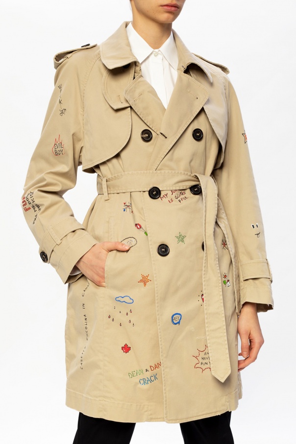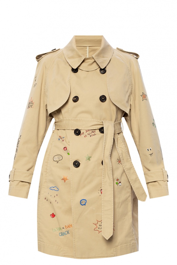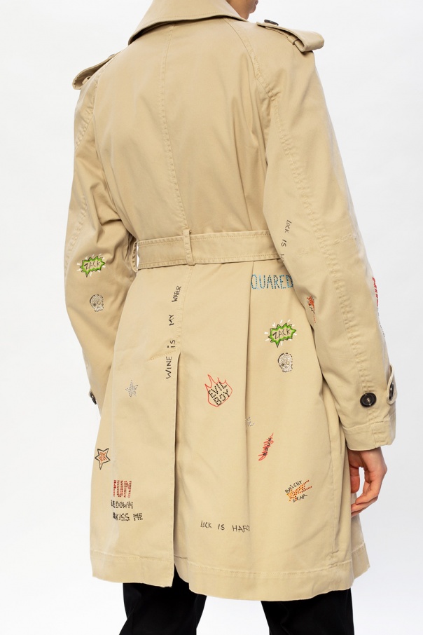Beige trench coat from Dsquared2. Enriched with glistening details and printed colourful lettering, this cotton-crafted style boasts a double-breasted silhouette with a button fastening, two pockets and long sleeves with button tabs to the cuffs.