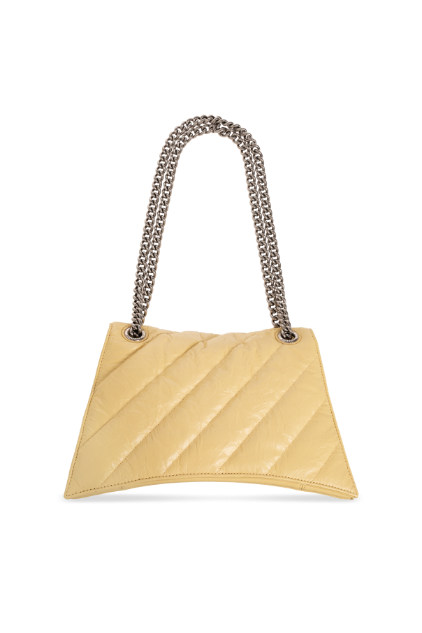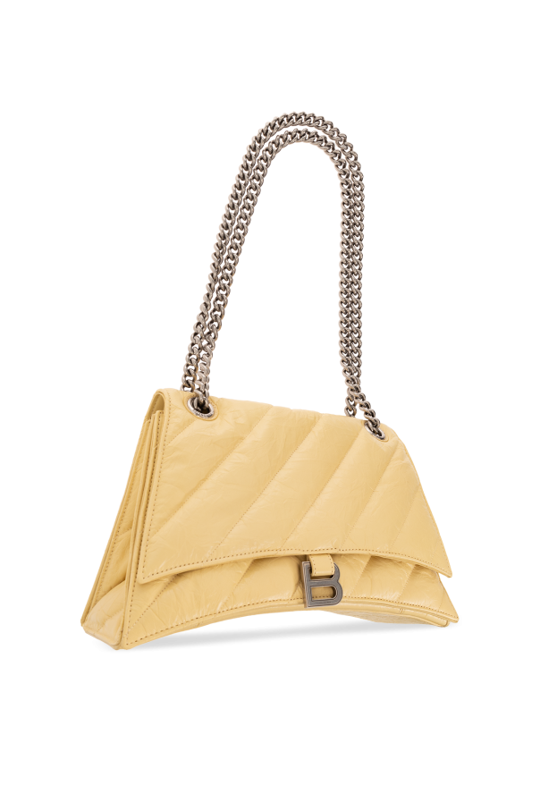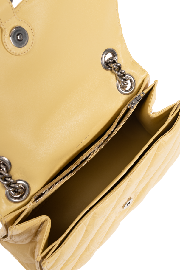 Light yellow ‘Crush Medium’ quilted shoulder bag from Balenciaga. Made of calf leather with a crease effect, this design features a snap closure, flap with a logo-engraved B charm, double chain, silver-tone metal hardware and one internal compartment with two slip pockets and one zip pocket.