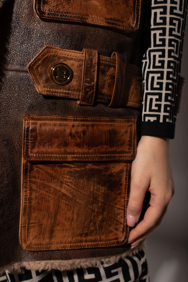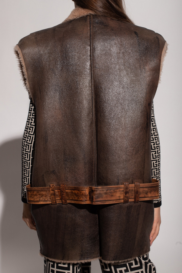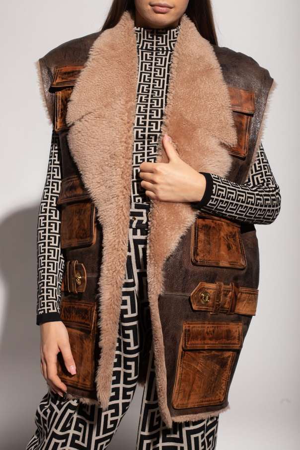 Brown sleeveless shearling coat from Balmain. Crafted from lamb leather and fur with an oversize silhouette, this style features padded shoulders, a waist-cinching belt, six flapped pockets and a gold-tone logo detail on the front.