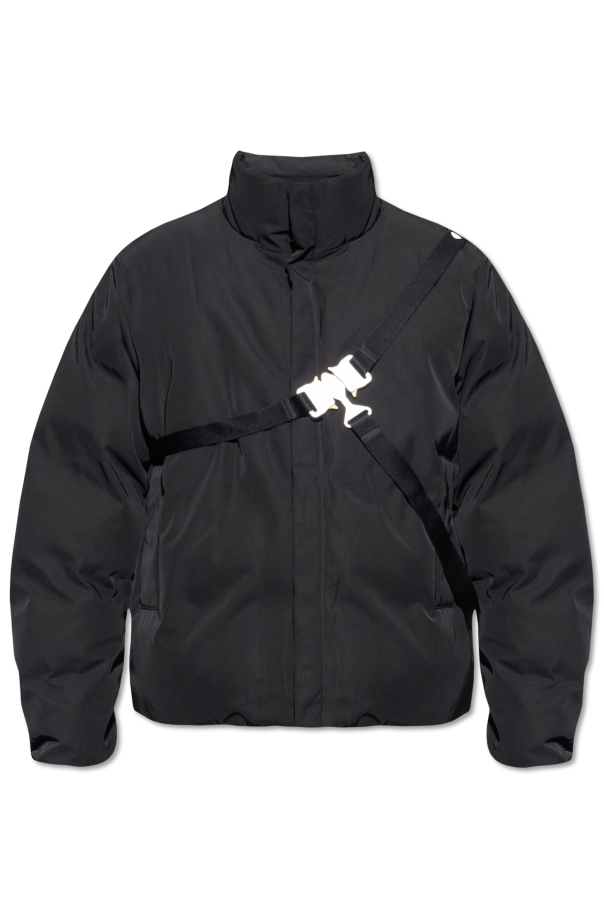 Black jacket from 1017 ALYX 95SM. Fastened with snap buttons with a concealed placket, this garment features detachable shoulder straps with the brand’s signature logo-engraved buckle in silver and gold-tone, two front pockets, drawstrings at the hem, long sleeves and polyester padding.