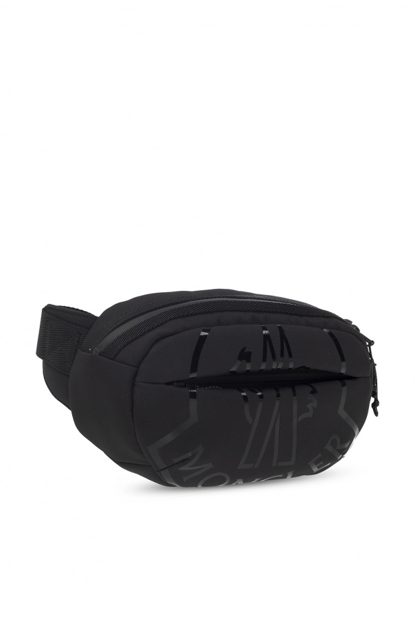 Black ‘Cut’ belt bag from Moncler. Fastened with a two-way zip, this model features a glossy logo print, decorative cut-out, front zip pocket, adjustable belt, one internal compartment and black metal hardware.