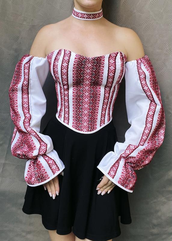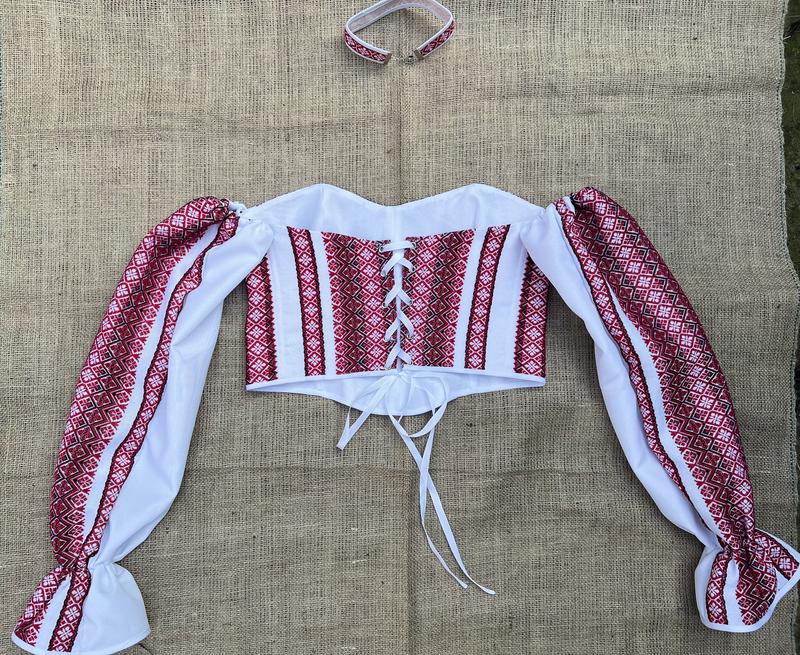 Корсетный топ ручной работы. Пошил индивидуально по вашим замерам. Чокер на застежке с удлинителем. Машинная вышивка. Корсетный топ на спинке регулируется шнуровкой. По желанию можно сделать как на петлях с металлическими кольцами, так и на люверсах. Вставленные косточки из регилина (китовой ус).Позвонка может быть выполнена из другой ткани. Максимальна утяжка до 5 см.