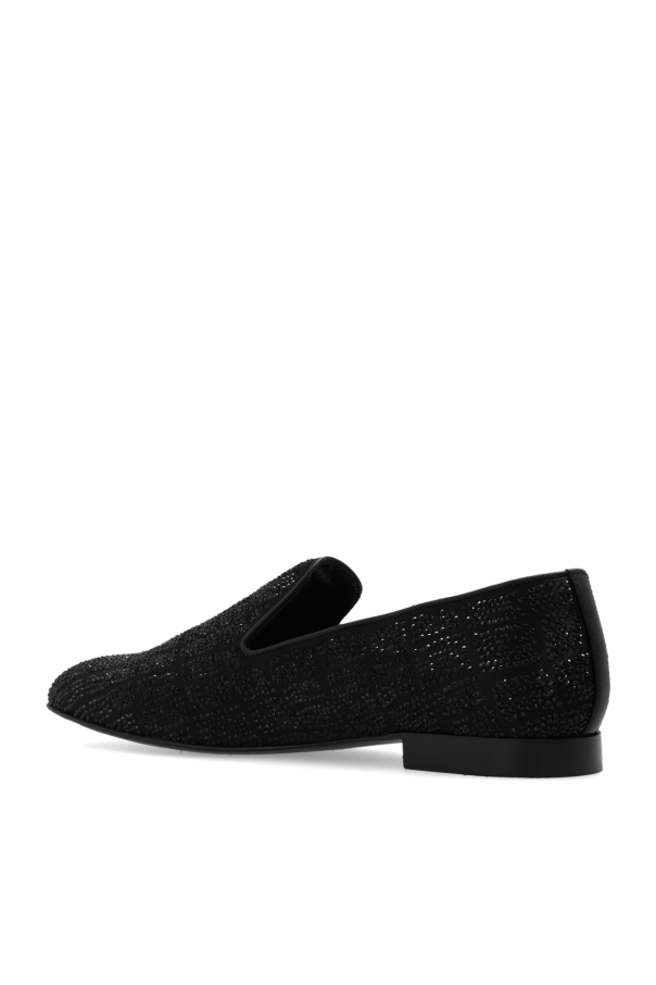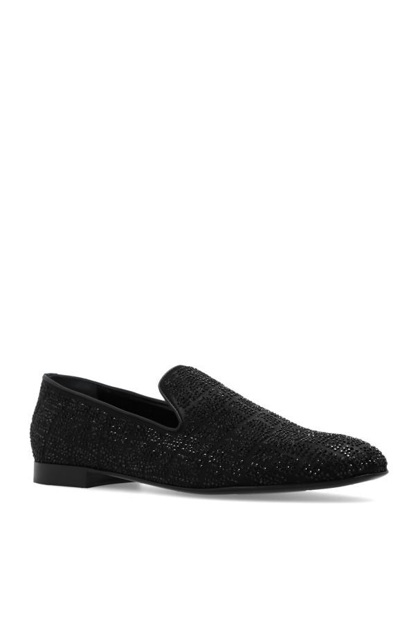 Black slippers from Versace. Rendered in satin and trimmed with leather, this model sits on a black leather sole and showcases crystal embellishments in glossy black.
