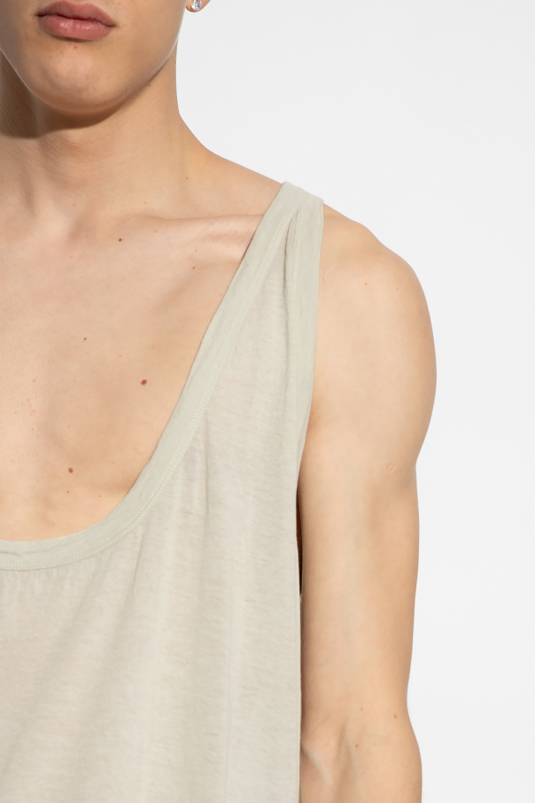 Greyish cream top from Rick Owens. Crafted from cotton with a semi-sheer finish, this style features frayed trims on the shoulder straps and bottom hem.