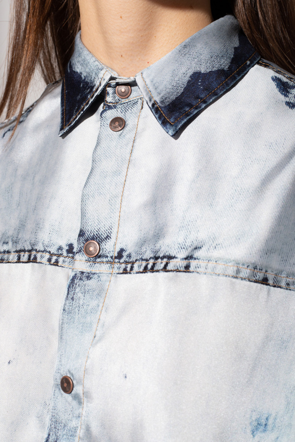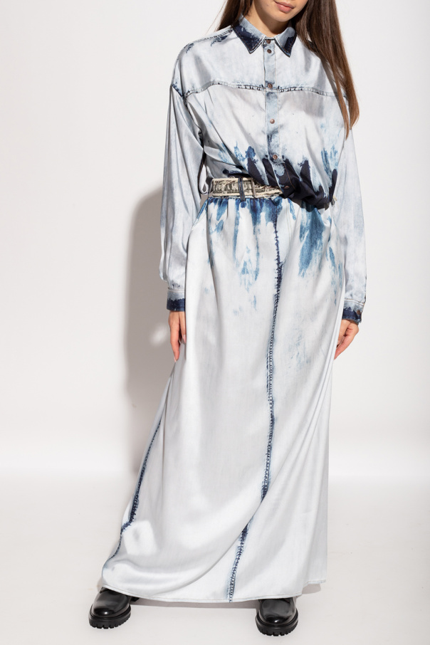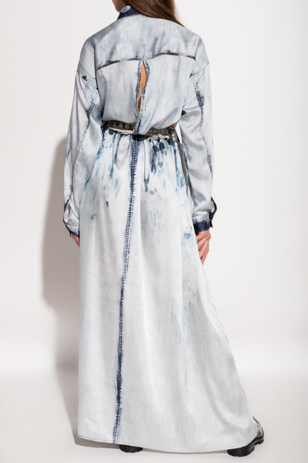 Light blue and navy blue two-piece maxi dress from Diesel. Crafted from a patterned fabric, this style features snap fastenings, cut-out detailing and long sleeves with snap closures on the cuffs. It comes with a green, cream and brown belt with a silver-tone buckle and a vintage treatment.