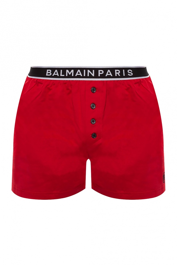 Red boxers from Balmain. Featuring front button closing, this pair is complete with a black and white elasticated waistband with the label's logo.
