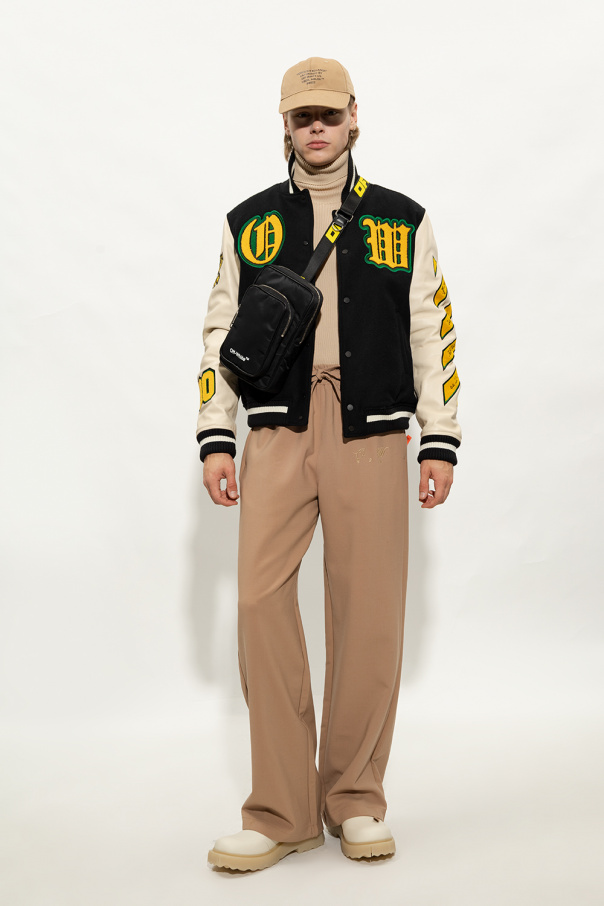 Cream ‘Sponge’ rain boots from Off-White. Resting on a cream rubber sole, this pair features a blue logo print and the brand’s signature zip tie in dark green.