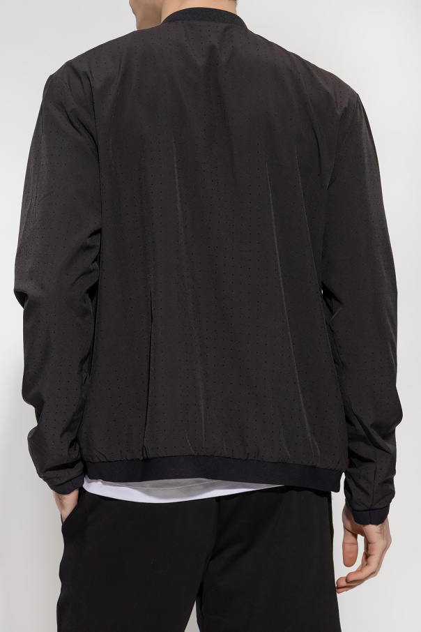 Black jacket with a stand collar from EA7 Emporio Armani. Made of perforated fabric, this garment features a zip fastening, logo patch, two front zip pockets and ribbed trims at the hem and cuffs.