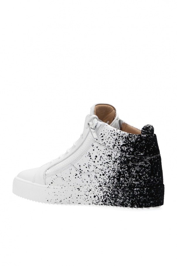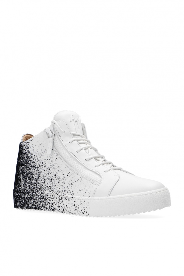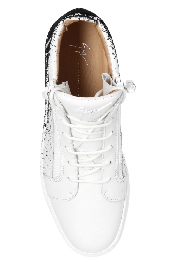 White ‘Kriss’ sneakers from Giuseppe Zanotti. Boasting metal logo hardware on the vamp, this high-top design features lace-up front, black velvet panels, zipped side vents and white rubber sole at the base.