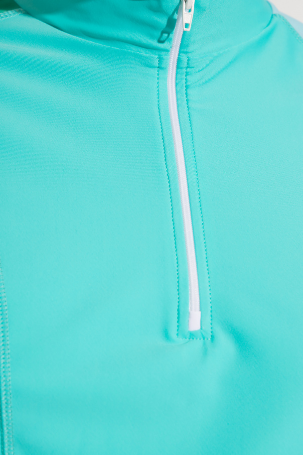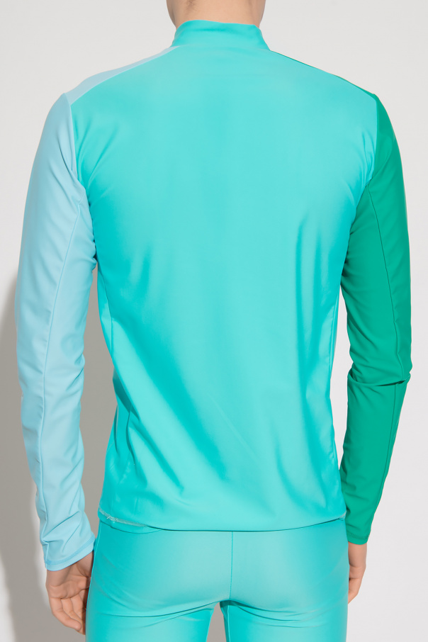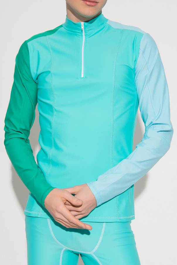 Blue and green training T-shirt from Jacquemus. Crafted from stretchy fabric, this style features a standing collar with a quarter-zip closure, long sleeves and decorative stitching details.