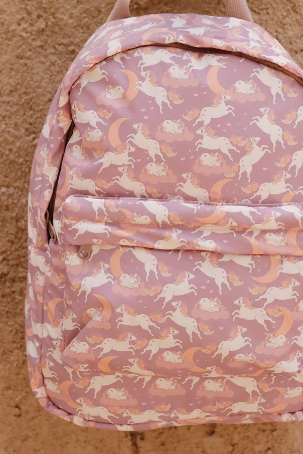 Dark pink backpack from Konges Slojd. Made of fabric with the OEKO-TEX® certificate and a BIONIC-FINISH® ECO coating. Fastened with a two-way zip, this model features a multicolored unicorn pattern, front zip pocket, side pocket, top handle, adjustable buckled shoulder straps and one internal compartment with one slip pocket and two pen holders.