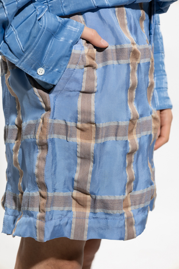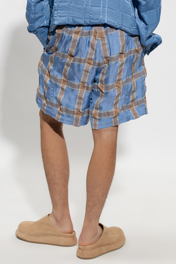 Blue and beige ‘Calecon’ shorts from Jacquemus. Embellished with a textured check pattern, this pair features an elasticated waistband, front button fastenings and three slip pockets.