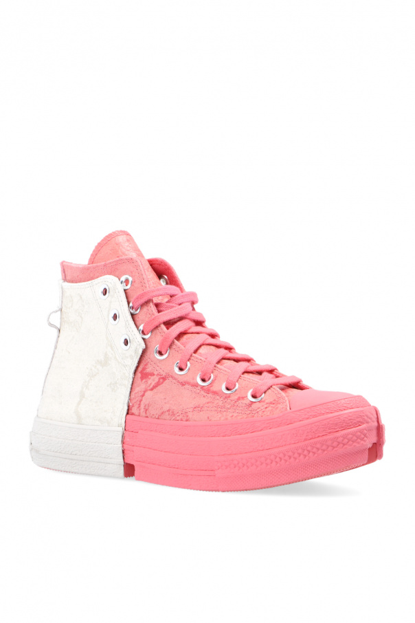 Pink and beige ‘Chuck 70’ high-top sneakers from Converse x Feng Chen Wang. Crafted from textured leather, this lace-up pair features a black logo print, silver-tone metal hardware and a double sole with cutouts made of pink and beige rubber.