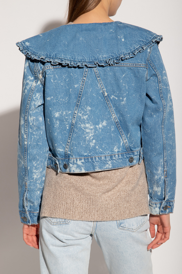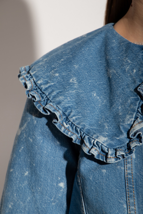 Light blue denim jacket from Ganni. Crafted from 100% certified organic cotton which has a lower environmental impact that conventional cotton, this style features a vintage wash, a distinctive ruffled peter-pan collar, button fastenings and long sleeves with button cuffs.