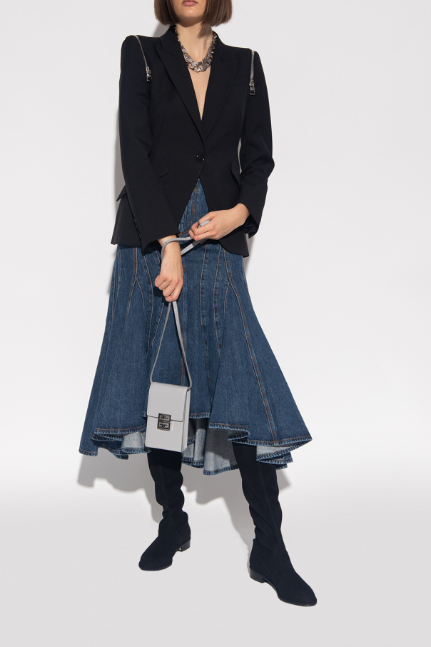 Black ‘Lowland’ thigh-high boots from Stuart Weitzman. Made of suede, this garment features ties at the back and a black rubber sole.