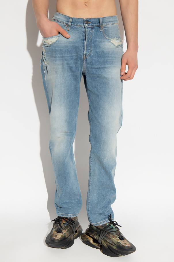 Blue ‘2020 D-VIKER L.32’ jeans from Diesel. Falling with straight legs, this pair features a logo patch on the front, button closures, classic five pockets and red monogram embroidery at the back.