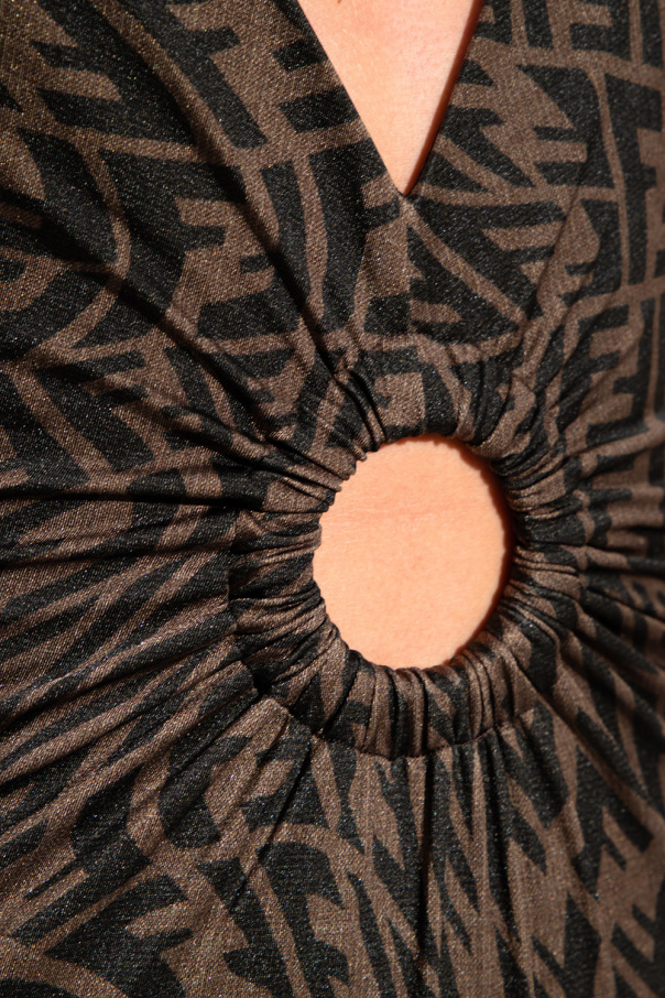 Brown one-piece swimsuit from Fendi. Flaunting a black logo pattern all-over, this style comes in a case and features a tie fastening at the neck, a covered ring detail and a bare back.