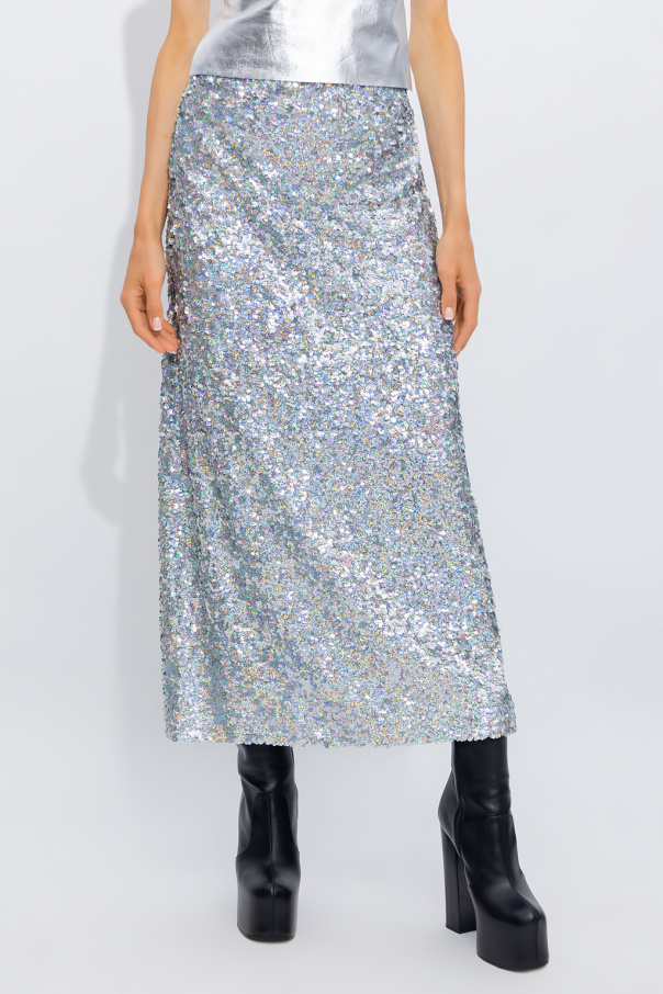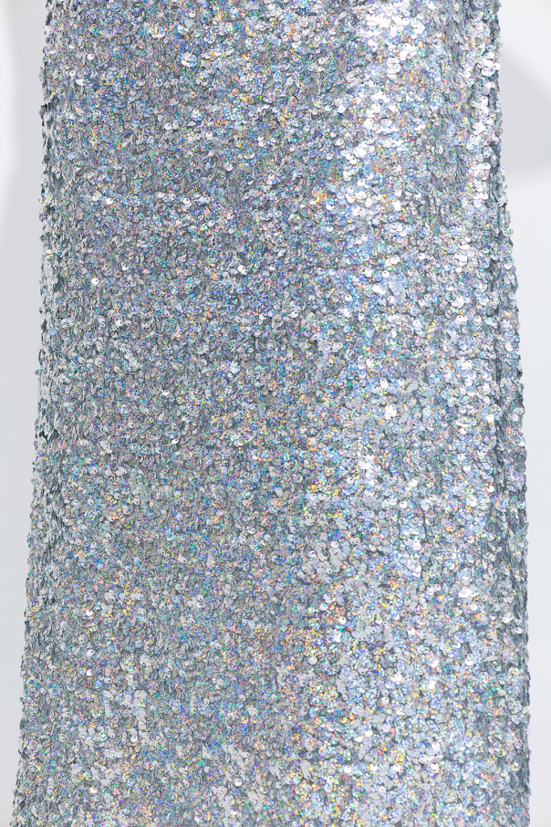 Silver-tone skirt from Dries Van Noten. Crafted with a holographical effect, this style showcases all-over sequins, a hidden zipper on the side, a gathered bodice and a side slit.