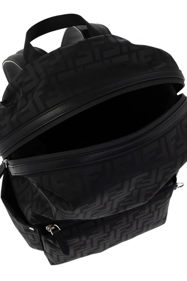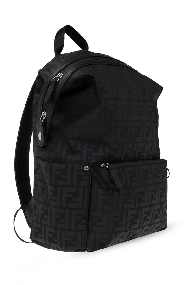 Black backpack from Fendi Kids. Crafted from monogrammed fabric and trimmed with leather, this design features a two-way fastening, one zip pocket on the front, two slip pockets on the sides, a half-round top handle, adjustable shoulder straps, silver-tone metal hardware and one internal compartment with a zip pocket.