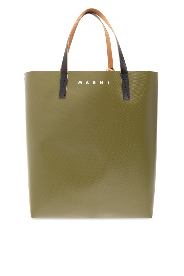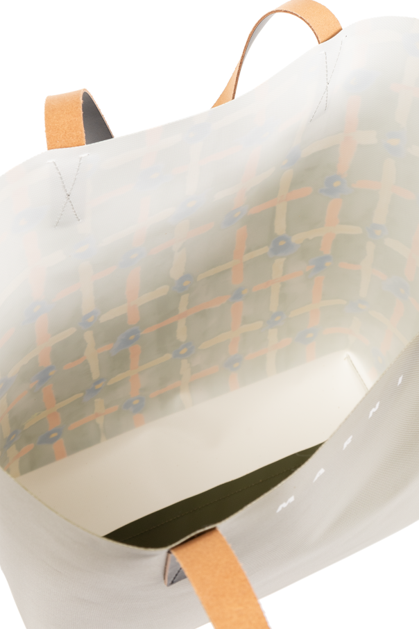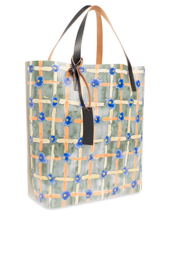 Greenish-grey ‘Tribeca’ shopper bag from Marni. Made of plastic and trimmed with black leather, this design showcases a colourful check pattern accompanied by flowers, two half-round handles accentuated with a logo-embossed pendant, and one internal compartment.