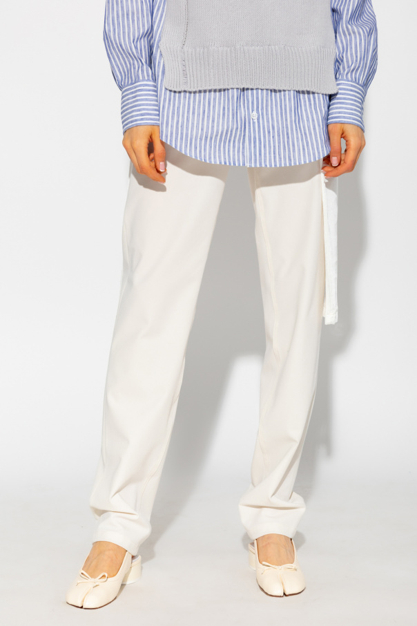 Cream trousers from MM6 Maison Margiela. Fastened with buttons, this pair falls down with slightly tapered legs and is complete with four slip pockets and decorative inserts with sleeves.