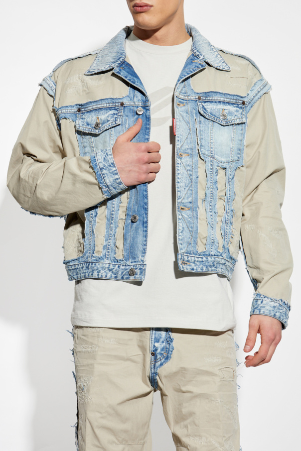 Indulge in the epitome of sartorial sophistication with the Dsquared2 Mixed Material Jacket. This exquisite piece, from the exclusive collection of the renowned fashion house Dsquared2, embodies a unique fusion of classic elegance and contemporary flair. Crafted from 100% cotton, the jacket showcases a harmonious blend of beige tones accented by striking blue denim elements adorning the shoulders, chest, collar, cuffs, and back, exuding a distinctive vintage charm. The jacket features a timeless design with a button closure and a statement collar. Two front flap pockets enhance its functionality while a small red tag on one pocket, emblazoned with \"DSQUARED2\", marks its pedigree. The artful distressing and fraying on the denim add a touch of retro allure, making it a quintessential piece for casual elegance. Designed with a relaxed, casual fit, this jacket is an essential addition to any wardrobe, effortlessly blending everyday style with high fashion. Why Choose This Product? Iconic design by acclaimed designers Dan and Dean Caten. Versatile and unique blend of materials and colors. Functional features with two buttoned flap pockets. Exquisite craftsmanship with a touch of vintage allure. Perfect for blending classic and modern styles.