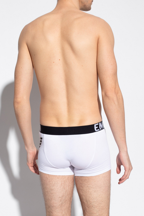 White boxers from Emporio Armani. Crafted from cotton, they feature a black graphic print with the brand\'s logo and an elasticated waistband with an embroidered logo.