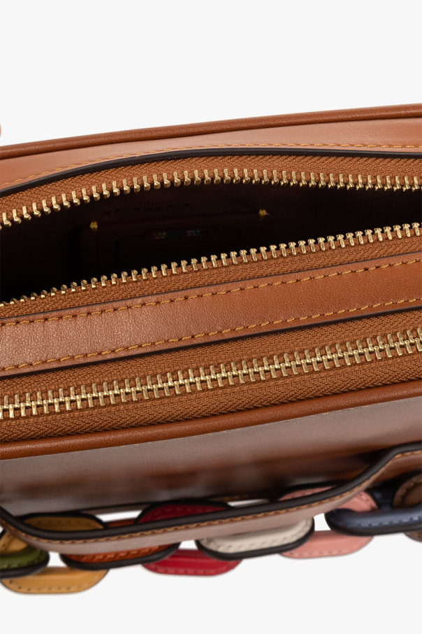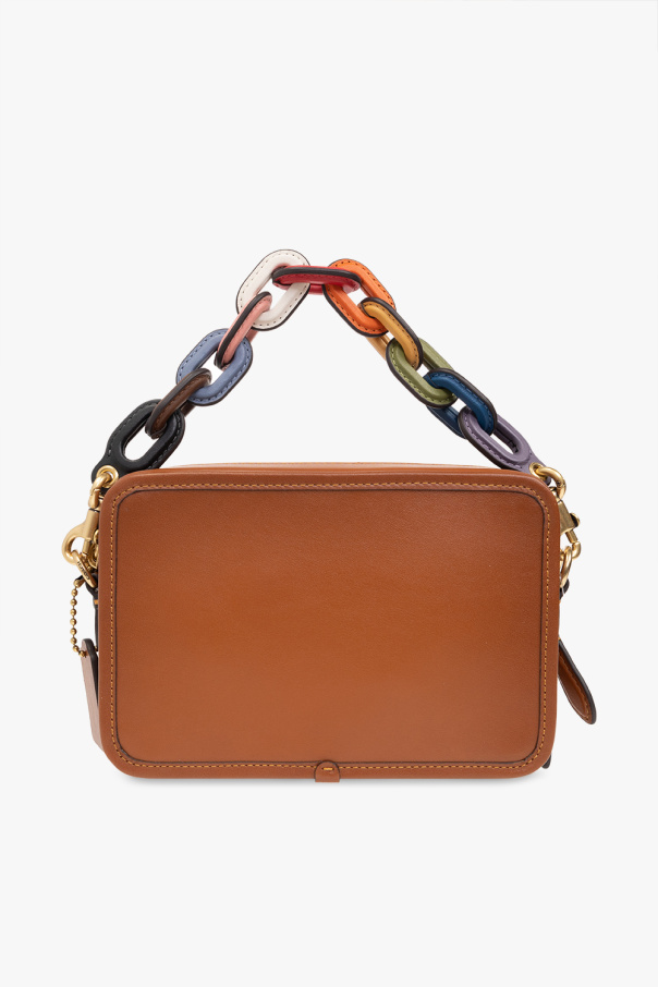Brown shoulder bag from Coach. Fastened with a two-way zip, this design features a logo-embossed handle, detachable and adjustable shoulder strap in maroon, multicolored chain, gold-tone metal hardware and two separate internal compartments with three card slots. Comes with a round pouch with a logo detail and three card slots.