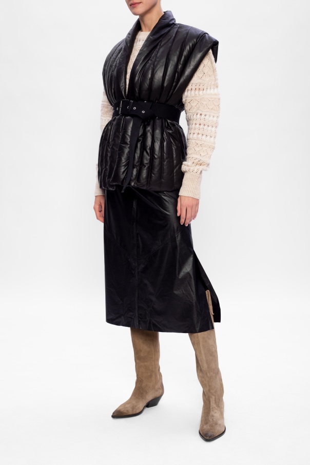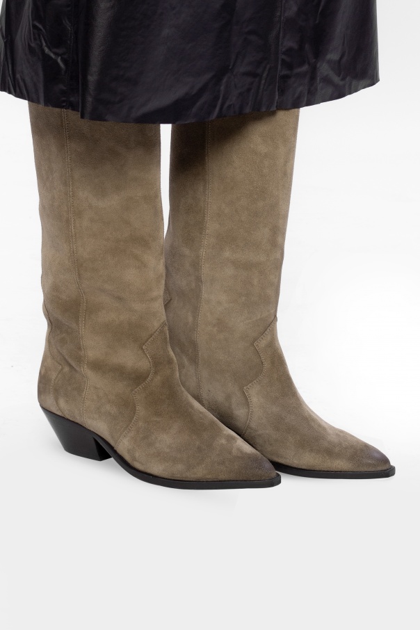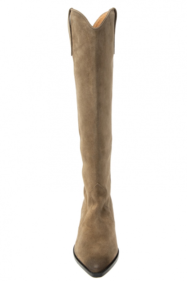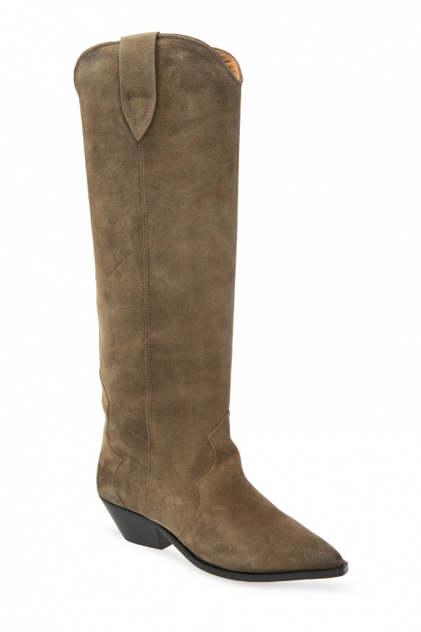Grey and green 'Denvee’ heeled knee-high boots from Isabel Marant. Crafted from suede with a pointed toe silhouette, they sit on a black and beige leather sole.