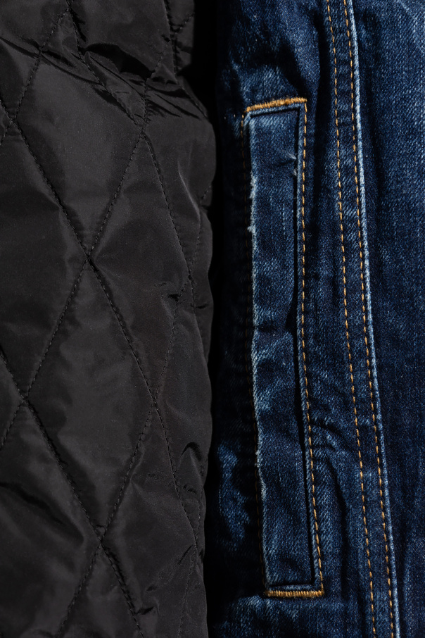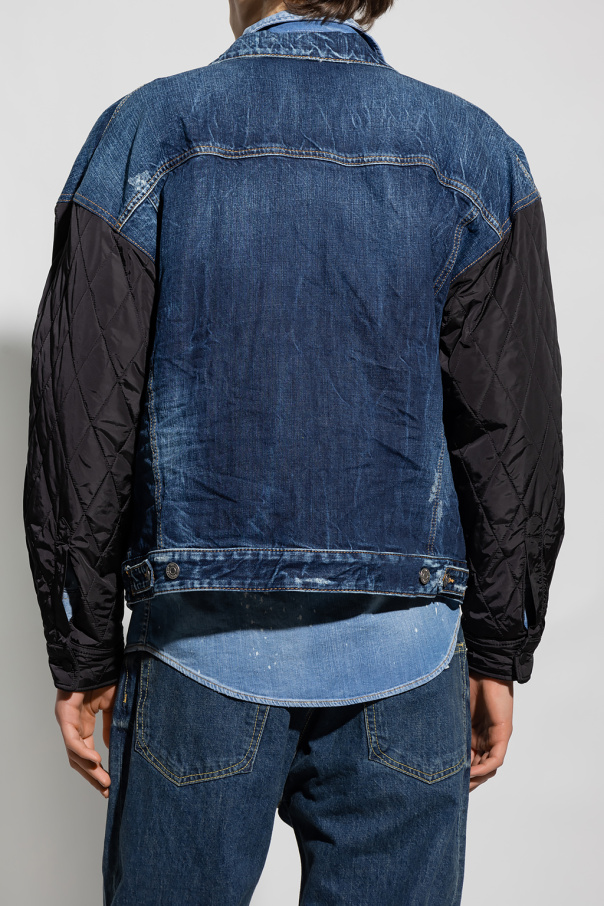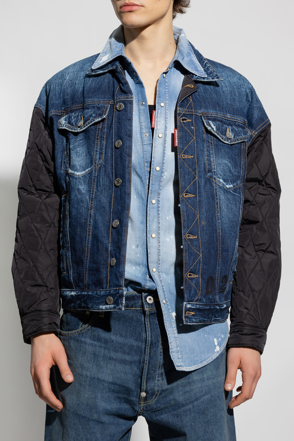 Navy and black denim jacket with a vintage effect from Dsquared2. Fastened with buttons, this garment features raised logo patches, two slip pockets, two flap pockets and quilted sleeves with buttoned cuffs.