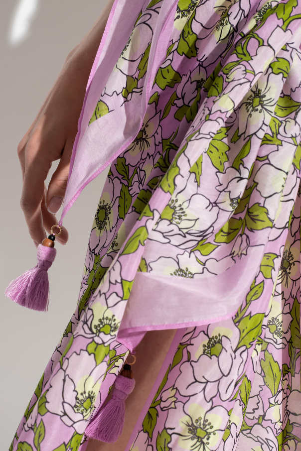 Purple pareo from Tory Burch. Crafted from a cotton and silk blend, this style showcases a green, yellow and black floral print and fringed edges.