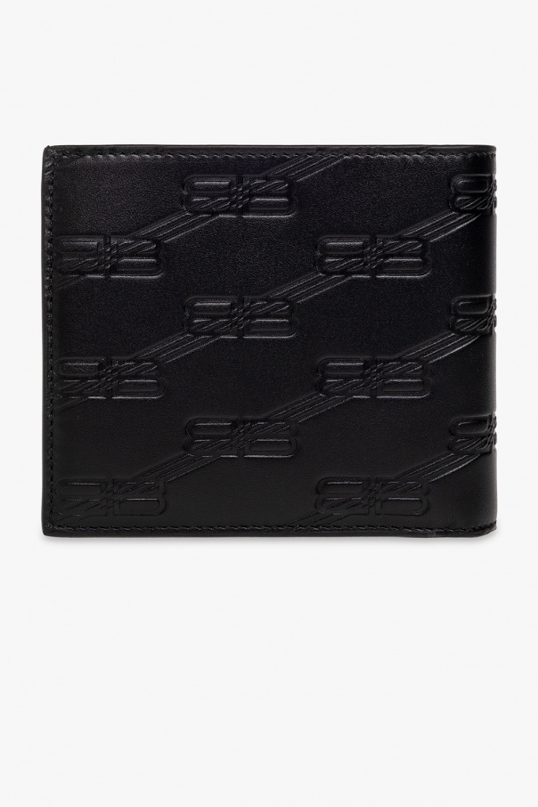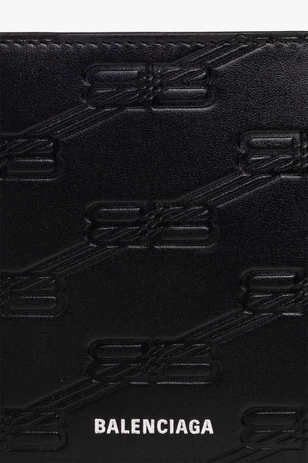Black folding wallet from Balenciaga. Crafted from calf leather, this design showcases an embossed monogram pattern. Printed at front with a silver-tone, it features one snap-fastened coin pocket, two bill compartments, two slip pockets and four card slots inside.