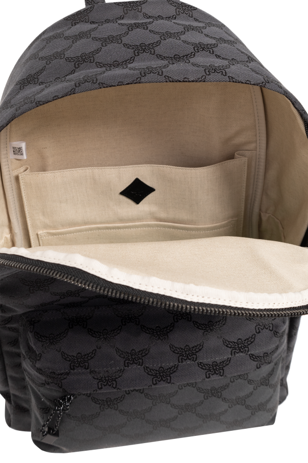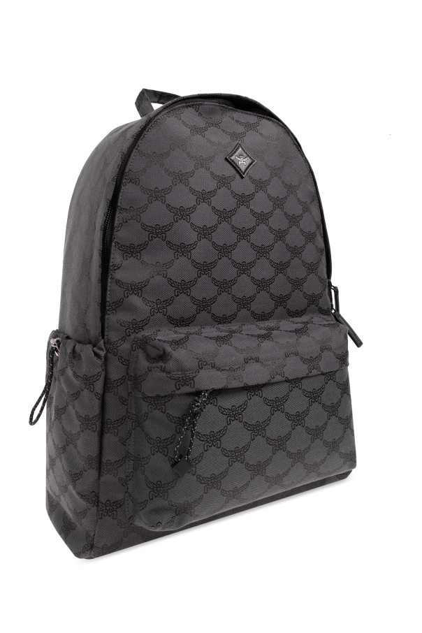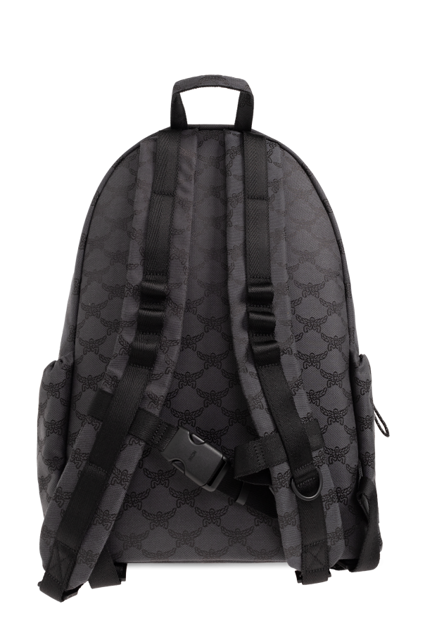 Dark grey and black ‘Himmel Medium’ backpack from MCM. Made of fabric with a jacquard Lauretos monogram pattern and leather trims, this model features a two-way zip, logo patch, zipped front pockets, two side pockets with drawstrings, half-round top handle, adjustable shoulder straps and one internal compartment.