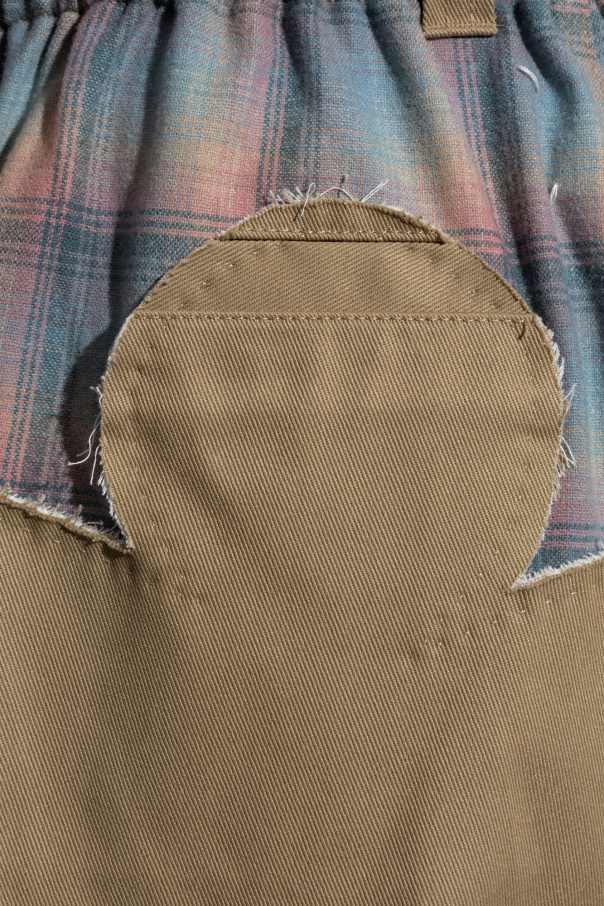 Beige trousers with a vintage effect from MAISON Margiela. Fastened with a zip, hook and button, this high-waisted pair features a multicolored fabric insert with a check pattern, pleats on the front, two pockets and wide, straight legs.
