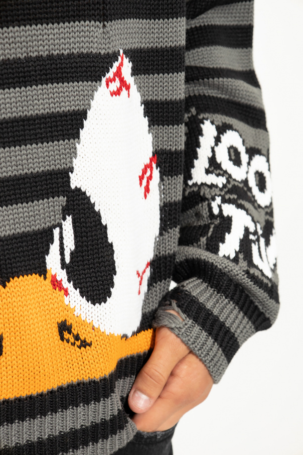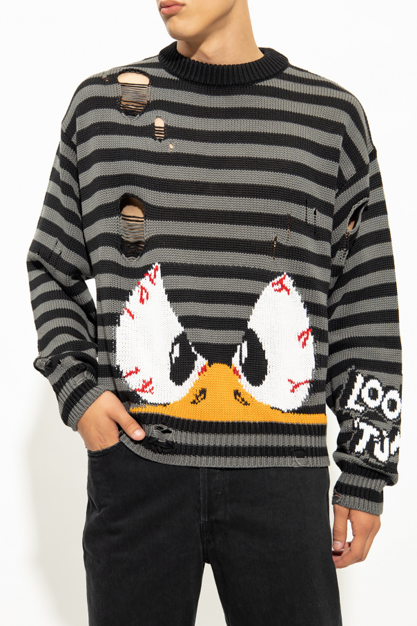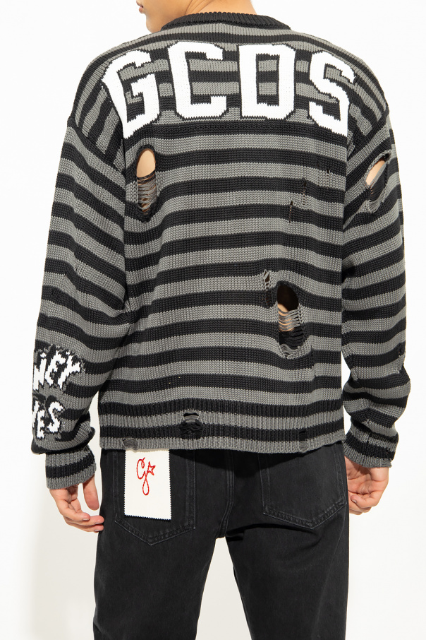 Grey and black sweater from GCDS. Crafted from wool, this long sleeve design features a decorative stripe pattern, worn effect, round neck and ribbed edges.