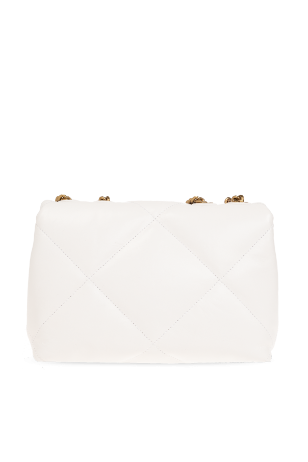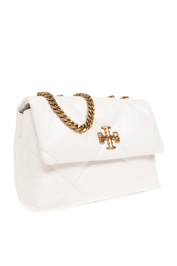 White ‘Kira Diamond Small’ quilted shoulder bag from Tory Burch. Made of leather, this design features a magnetic snap closure, metal Double T logo, shoulder strap with chain inserts, gold-tone metal hardware and one internal compartment with one zip pocket and one slip pocket.
