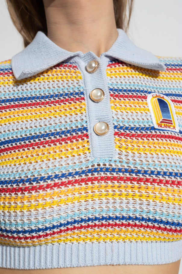 Multicoloured polo shirt from Casablanca. Crafted from cotton with a distinctive knit, this style features a cropped fit, a stripe pattern, buttons with a glass pearl trim, a logo patch, short sleeves and elasticized trims.